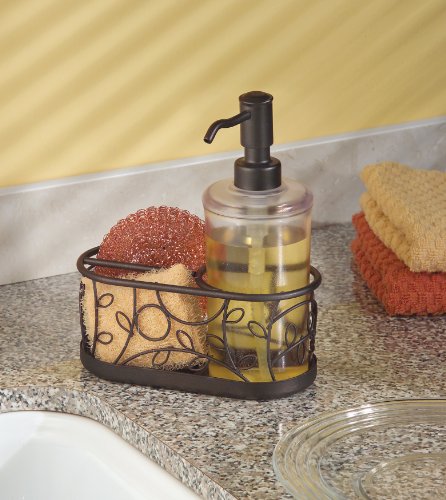 Washing the dishes never looked so good. This Twigz Soap and Scrubby Center by InterDesign combines function with beauty in a unique design. The sink caddy, made from sturdy metal wire, features three compartments; one large to hold a soap pump and two smaller ones for scrubber and sponge. The soap pump and scrubby holder is adorned with a twig and leaf design and has a classic bronze finish. The soap pump comes complete with a copper scrubby and clear bottle that will hold 13 ounces of your favorite dish or hand soap. Displays beautifully on your kitchen countertop around the sink area.
